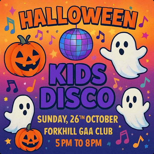 Join us at the Forkhill GAA Club for a fantastic Halloween Disco on Sunday, October 26th! The festivities will run from 5 PM to 8.00 PM. The entry fee is just £3 per child..Parents can relax and enjoy the wee bar while the kids participate in exciting activities. There will be a costume parade where children can show off their creative outfits, and prizes will be awarded for the best costume! Get ready for an evening filled with dancing, fun, and plenty of laughter. Don’t miss out on this spooktacular event!